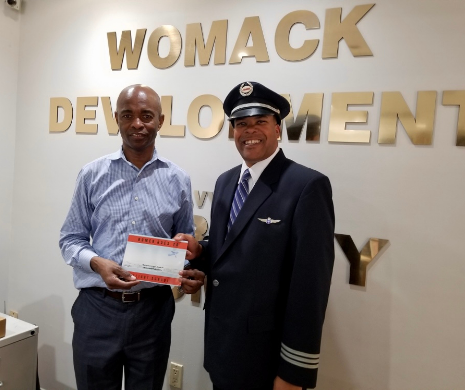First Officer Homer Randle III, thanking Gerald Womack for a college scholarship that he and Congresswoman Sheila Jackson Lee helped facilitate for the Aviator 21 years ago.